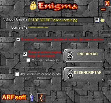 - Enigma: Enigma asegura la privacidad de los archivos deseados mediante una contraseña. Encripta cualquier tipo de archivo así como carpetas.